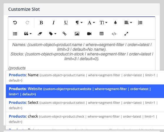 và sau đó là tên của đối tượng tùy chỉnh. Giống {product